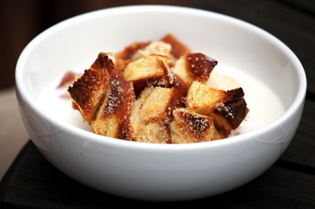 Pane ahi 200 kraadi juurde soojenema. Määri ahjuvorm võiga. Tükelda sai kuubikuteks ning pane pooled saiakuubikutest ahjuvormi. Nende peale laota ühtlaselt õunamoos. Seejärel kalla moosi peale ülejäänud saiakuubikud. Klopi kausis lahti munad ja piim, lisa sinna hulka ka kaneel. Vala see segu ühtlaselt üle saiakuubikute. Seejärel pane kuubikute peale võitükikesed...