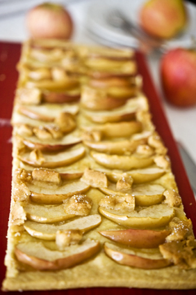 Rulli lehttainas lahti, aseta tainas küpsetuspaberiga kaetud ahjuplaadile. Tee tervava noaga igast taina välisservast u. 1 cm kauguselt sisselõige (see aitab tainaäärtel kerkida). Riivi martsipan ja sega munavalgetega, kata tainas martsipani-munavalgeseguga. Koori ja viiluta õunad, kata õuntega koogipõhi. Mõõda purukatte koostisained kaussi ja näpi puru-taoliseks. Raputa puru õuntele ja küpseta 200-kraadises...
