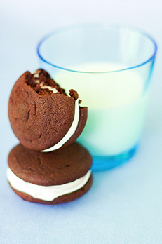 Kuumuta ahi 175 kraadini ja valmista ette kaks 24 cm-se läbimõõduga koogivormi nende põhjad küpsetuspaberiga kattes. Aseta ühte koogivormi küpsisepoolikud nii, et kreemine osa jääb ülespoole. Sega kokku kuivained (suhkur, jahu, kakao, küpsetuspulber, vanillisuhkur, sooda ja soola). Lisa munad, piim, õli ja mikserda segu keskmisel kiirusel 2 minutit. Lisa äsja...