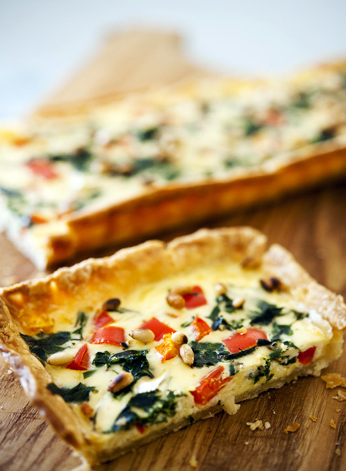 Sega kokku taigen – näpi külmad võitükid jahuga, lisa lahtiklopitud muna ja külm vesi. Pane 30 minutiks külmkappi. Rulli lahti 24 cm-se pirukapõhjale sobivaks ning tõsta vormi, kattes sellega põhja ja servad. Pane veel 30 minutiks külmkappi. Vahepeal valmista ette täidis. Riivi juust ja haki paprika. Pese korralikult naadid, kalla...