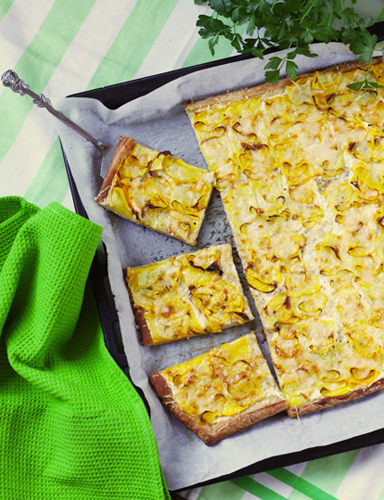 Lõika suvikõrvits köögimandoliini või terava noa abil õhukesteks viiludeks. Pane kaussi, lisa hakitud küüslauk ning sorts oliiviõli, maitsesta julgelt soola-pipraga. Sega käte abil õrnalt läbi ning lase kümmekond minutit maitsestuda. Rulli pärmi-lehttainas veidi õhemaks ja tõsta 30×45 cm suurusele ahjuplaadile. Tee tainaservadele noaga umbes 1-1.5 cm kaugusele servast kerge sisselõige. Sega...
